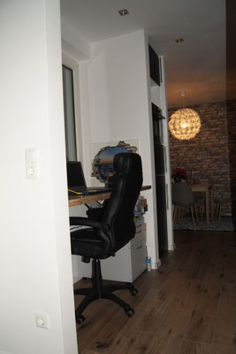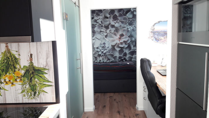 Das Wohnzimmer geht in den Flur über, der wie ein Birkenwald gestaltet ist.