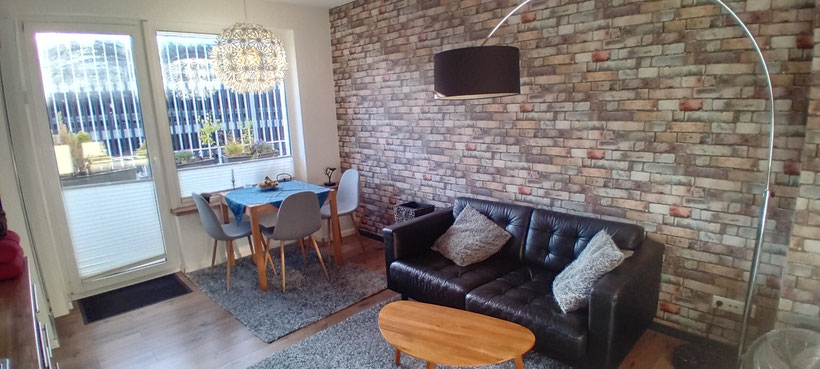 Das helle Wohnzimmer ist das Herzstück der Wohnung, Zugang zum grossen Südwest-Balkon mit integrierter, komplett ausgestatteter Küche mit Backofen/Mikrowelle, Kühl- und Gefrierschrank und Spülmaschine. Kaffeemaschine, Wasserkocher, Saftpresse, Mixer, Geschirr, Gläser, Bestecke, Töpfe und Pfannen, Vorratsdosen, Geschirrhandtücher und vieles mehr zählen zur komfortablen und praktischen Kücheneinrichtung.